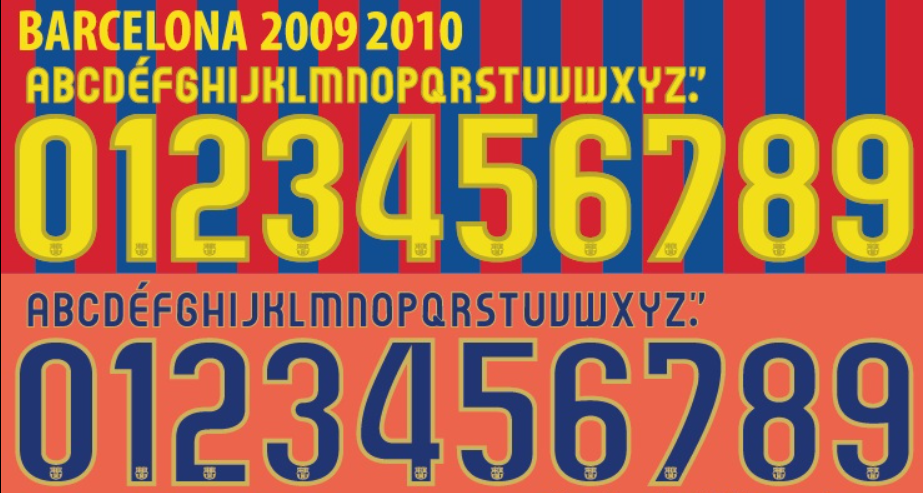Nos uniformes titulares Blaugrana, a fonte era aplicada em um amarelo vibrante, criando um contraste icônico. Já no uniforme “Away” (verde-azulado), ela aparecia em preto ou branco. Diferente das fontes modernas cheias de cortes e ângulos agressivos, esta fonte tem um charme “clássico-moderno” que envelheceu muito bem, sendo perfeita para projetos que evocam nostalgia e classe.