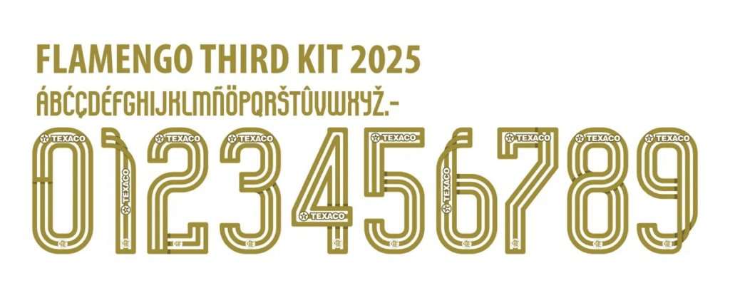 A fonte desenvolvida pela Adidas para o terceiro manto do Flamengo em 2025 é uma verdadeira declaração de modernidade. Ela apresenta traços robustos e angulares, com “cortes” estratégicos que sugerem movimento e dinamismo.