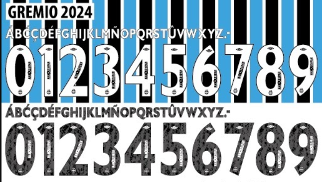 A tipografia desenvolvida pela Umbro para o Grêmio em 2024 segue uma linha estética robusta e geométrica, facilitando a leitura tanto no estádio quanto na transmissão televisiva.