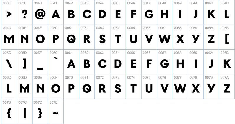 - Conteúdo: Numeração completa e alfabeto em caixa alta (uppercase), incluindo caracteres especiais alemães (umlaut).