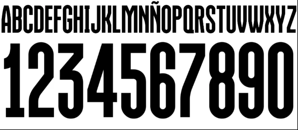 A New Balance desenvolveu para o Modena FC uma fonte que mistura o clássico com o contemporâneo. A tipografia apresenta um peso médio a robusto (Bold), ideal para visualização rápida nas costas da camisa.