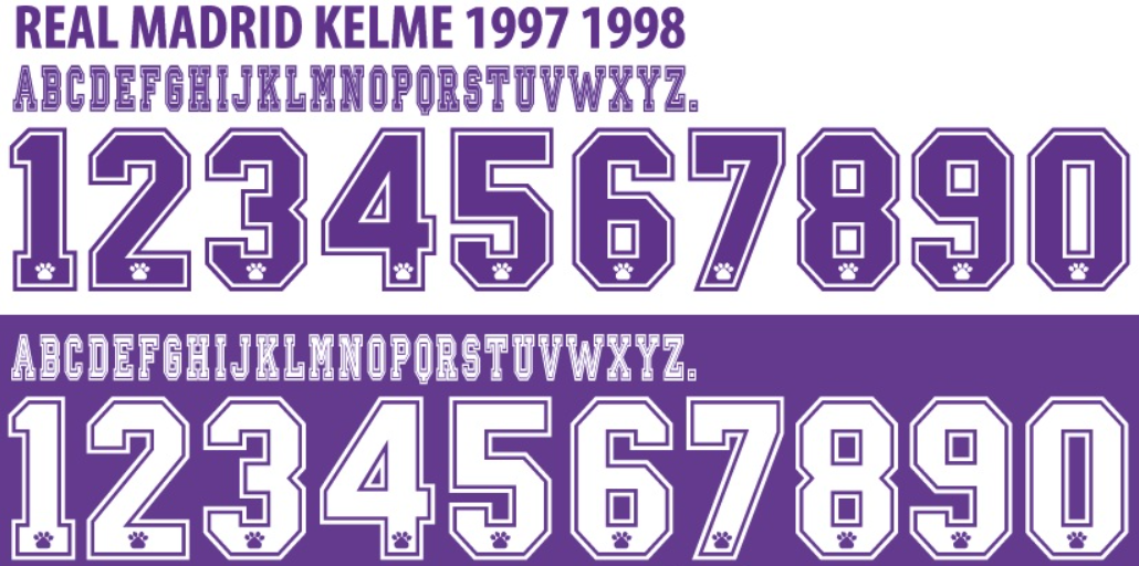 Neste post, trazemos a fonte lendária utilizada pela fornecedora Kelme no uniforme que consagrou craques como Raúl, Roberto Carlos, Seedorf e Mijatović na conquista da inesquecível “La Séptima” Champions League.