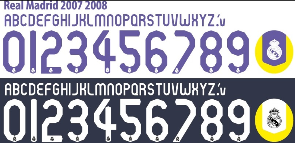 A tipografia de 2008-2009 da Adidas para o Real Madrid se destaca pela sua sobriedade e legibilidade. Diferente de fontes mais experimentais de anos posteriores, este estilo aposta em letras levemente condensadas e números robustos com bordas arredondadas, transmitindo uma sensação de estabilidade e classe.