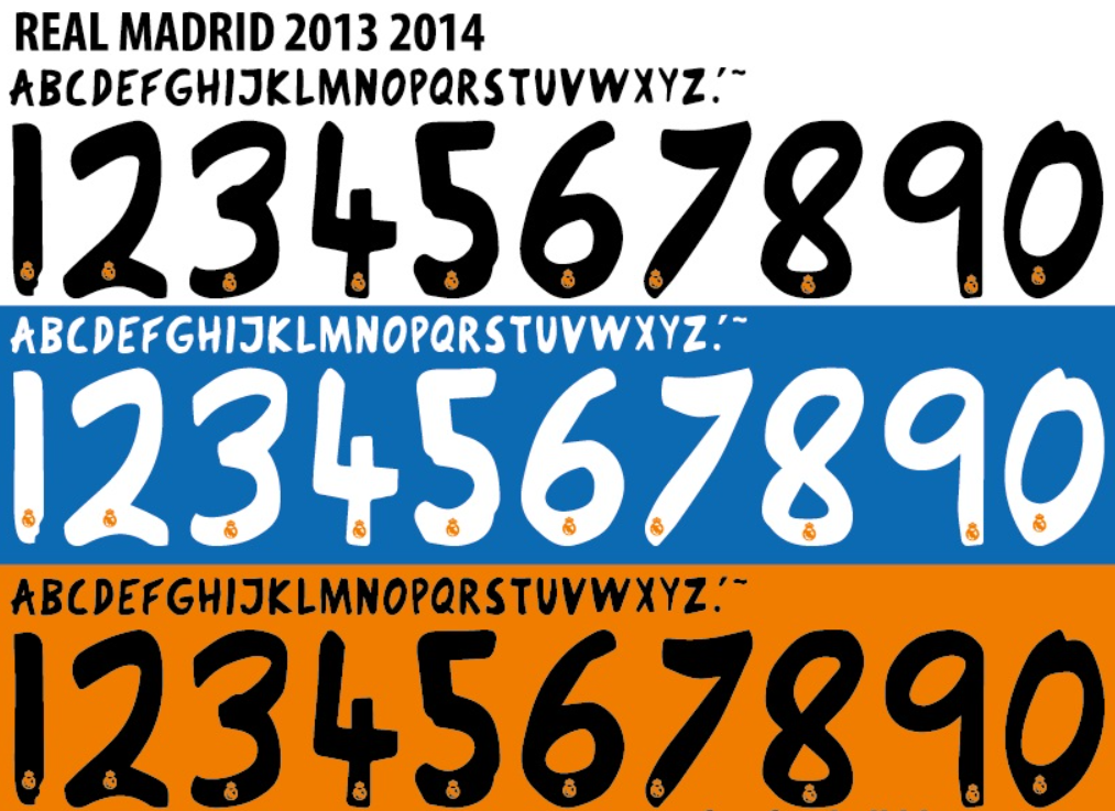 A fonte de 2013-2014 foge completamente do padrão “blocado” e rígido que a Adidas costumava aplicar em anos anteriores. Ela apresenta um design mais fluido e orgânico, quase simulando uma escrita manual estilizada, mas mantendo a legibilidade necessária para o esporte.
