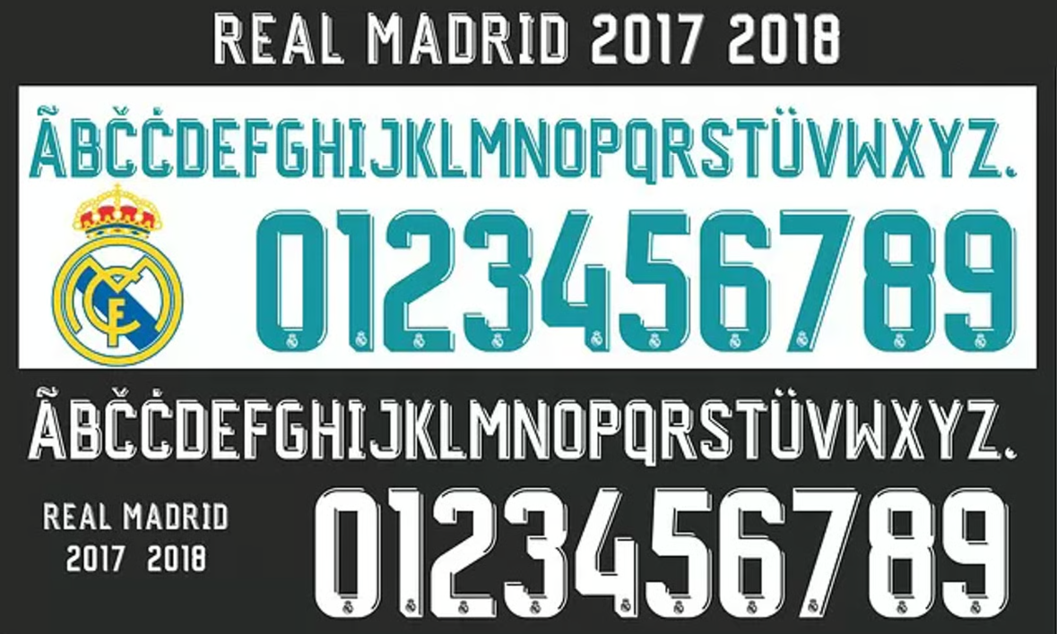A tipografia criada pela Adidas para o Real Madrid nesta temporada fugiu do padrão. Diferente das fontes clássicas e rígidas, esta fonte apresenta um estilo moderno, levemente arredondado e com uma pegada “digital” irregular.