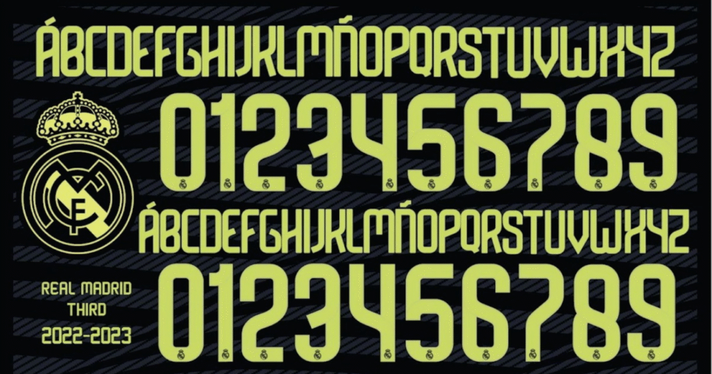 A tipografia do Real Madrid para o Third Kit apresenta um design moderno com toques clássicos. Ela se destaca pela geometria limpa, sem serifas excessivas, o que garante excelente legibilidade mesmo à distância.