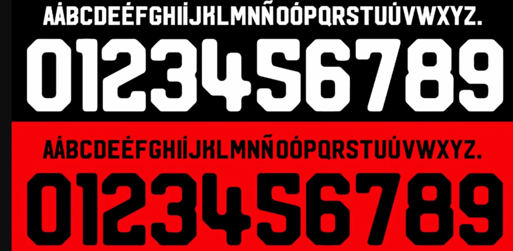 A tipografia desenvolvida pela Adidas para o São Paulo em 2023 é moderna, limpa e imponente. Ela apresenta um design robusto, com cantos ligeiramente chanfrados (cortados) que dão uma sensação de movimento e agressividade. Os números são largos e de excelente legibilidade, garantindo visibilidade máxima tanto no campo quanto em peças gráficas.