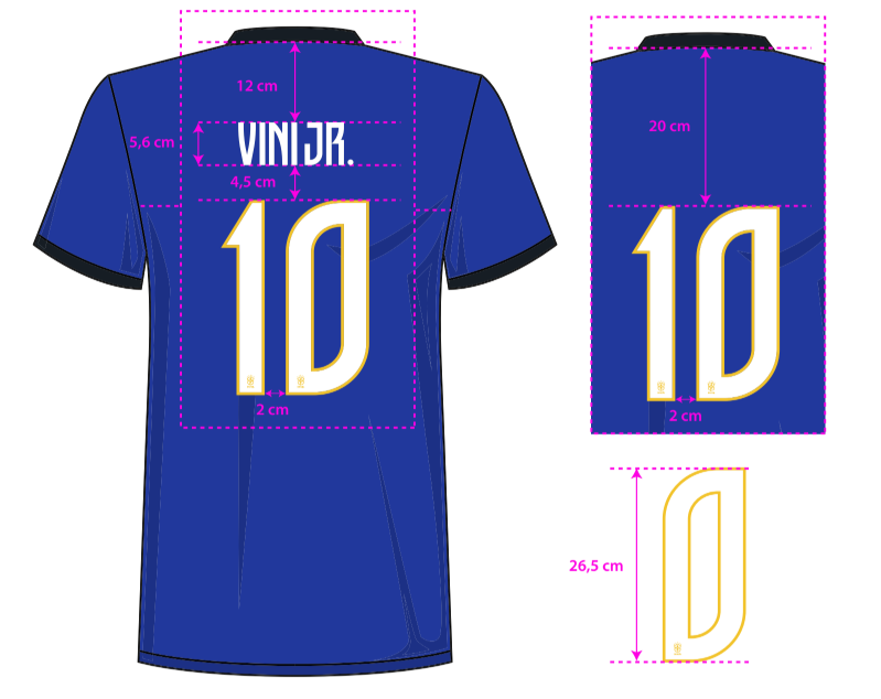- Uniforme 2 (Away): Aplicada em branco, amarelo ou verde claro sobre a base azul escuro da camisa.