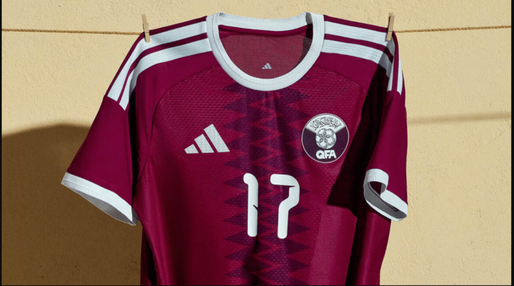 A tipografia do Catar para o ciclo 2026 mantém a identidade visual sofisticada que marca a seleção. A fonte apresenta traços que homenageiam a caligrafia árabe, com curvaturas sutis e cortes angulares modernos.