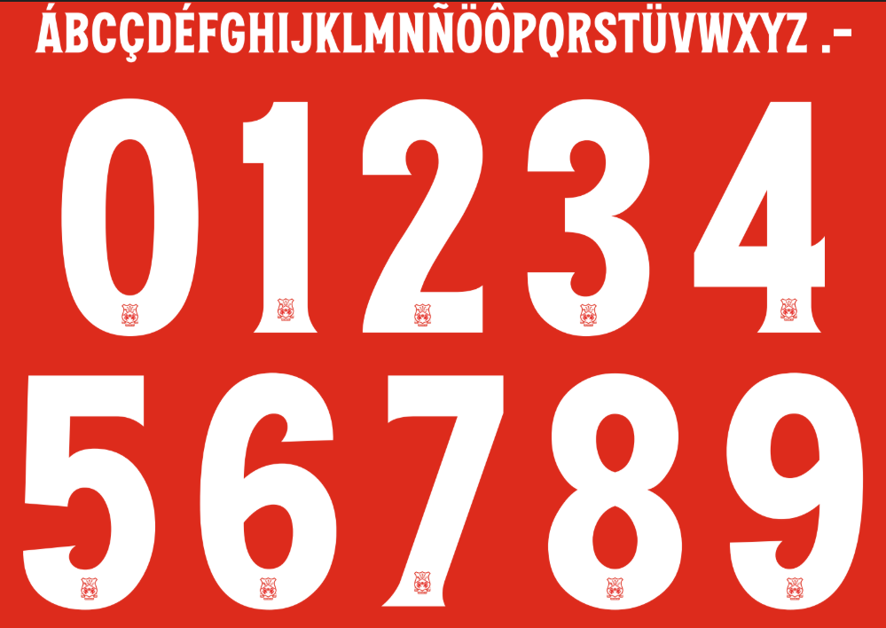 - Aplicação: Nos uniformes oficiais, a numeração geralmente aparece em branco (no kit Home) ou em vermelho/preto (nos kits Away e Third), criando um contraste forte.
